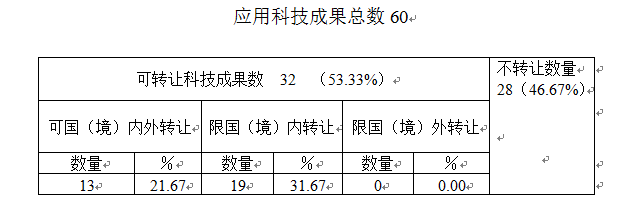 對(duì)有轉(zhuǎn)讓意向科技成果的分析。60項(xiàng)應(yīng)用類科技成果中不轉(zhuǎn)讓的成果為28項(xiàng)(占應(yīng)用類成果的46.67%);有轉(zhuǎn)讓意向的成果為32項(xiàng)(占應(yīng)用類成果的53.33%),其中:可國(境)內(nèi)外轉(zhuǎn)讓13項(xiàng);限國(境)內(nèi)轉(zhuǎn)讓19