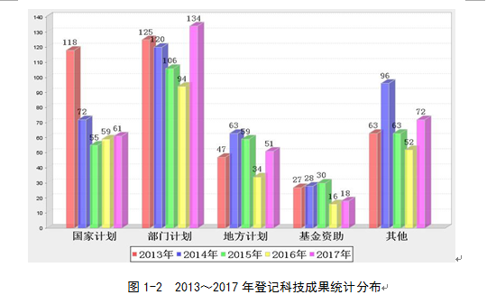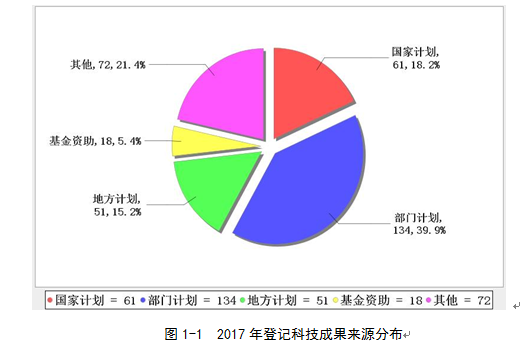 2017年登記的科技成果以部門計劃為主,共計134項,占登記總數的39.9%,比2016年增加40項。國家科技計劃61項(其中,自然科學基金12項,科技支撐計劃9項,科技基礎性工作專項5項,高技術研究發(fā)展計劃3項,科技重大專項2項,重點基礎研究發(fā)展計劃2項,國家軟科學研究計劃2項,火炬計劃1項,其他25項)占登記總數的18.2%,比2016年增加2項。地方計劃51項,占登記總數的15.2%,比2016年增加17項?;鹳Y助科技成果(除國家基金以外的部門基金、地方基金、)18項,占登記總數的5.4%,比2016年增加2項。其他科技成果(包括國際合作、橫向委托和自選等)72項,占登記總數的21.4%,比2016年增加20項。(見圖1-1、1-2)