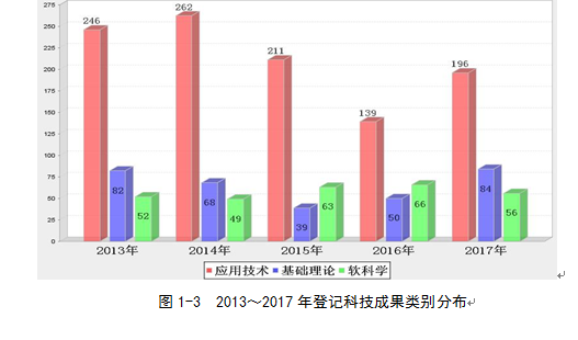 2017年登記科技成果按照成果類別劃分可分為應用技術類、軟科學類和基礎理論類三種,其中,應用技術成果196項,占登記總數的58.3%,比2016年增加57項?;A理論成果84項,占登記總數的25.0%,比2016年增加34項。軟科學成果56項,占登記總數的16.7%,比2016年減少10項。(見圖1-3)