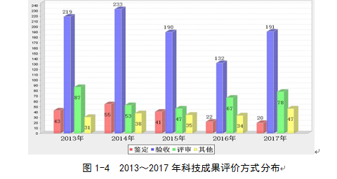 2017年登記的科技成果中,評價方式主要以驗收項目為主,共191項,評審項目數78項,鑒定項目數20項,其他評價方式47項。今后,科技成果評價將更多地通過市場來檢驗,第三方評價等方式將逐步增多(見圖1-4)