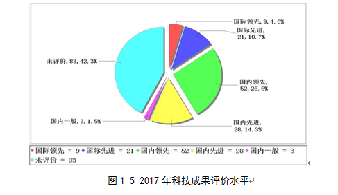 2017年登記的196項應用技術類成果中,水平達到國際領先的成果9項,占4.6%;達到國際先進的成果21項,占10.7%;達到國內領先的成果52項,占26.5%;達到國內先進的成果28項,占14.3%;達到水平一般的成果3項,占1.5%;未評價的成果83項,占42.3%。(見圖1-5)