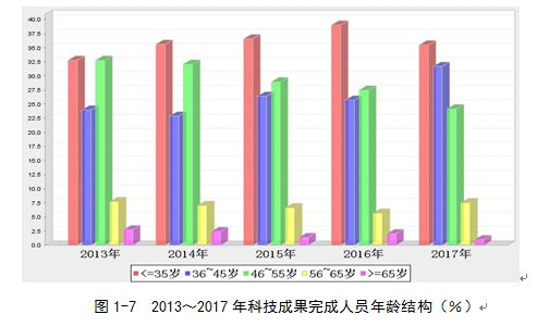 2017年,從科技成果完成人員的年齡結構看,主要集中在以下年齡段:35歲以下(含35歲),占比35.5%;36~45歲,占比31.7%;46~55歲,占比24.2%。 (見圖1-7)。