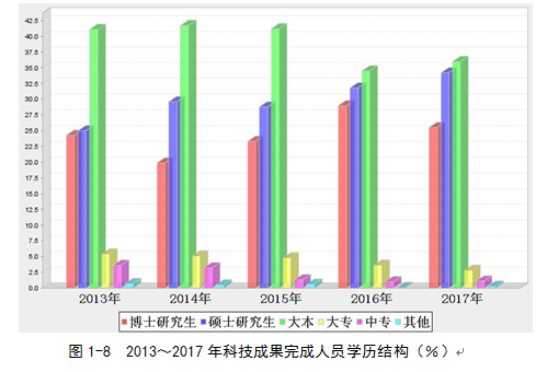 2017年,從學歷構成看,科技成果完成人員主要集中在:本科,占比36.0%;碩士研究生,占比34.2%;博士研究生,占比25.5%。(見圖1-8)。