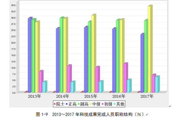 2017年,從職稱構成看,主要集中在:中級,占比34.5%;副高,占比28.8%;正高,占比23.3%。(見圖1-9)。
