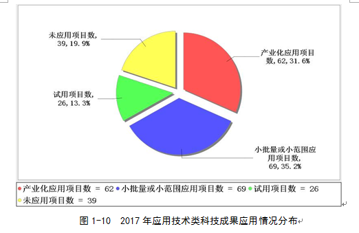 登記的應用技術類科技成果中,小批量或小范圍應用項目數的科技成果保持著較高的比例,為69項,占35.2%;產業(yè)化應用項目數項目為62項,占31.6%;試用項目數項目為26項,占13.3%;未應用項目數為39項,占19.9%(見圖1-10)。從總體上看,成果未應用的主要原因是管理問題和政策因素,分別占48.7%和20.5%;其次是市場問題、資金問題和技術問題,分別占17.9%、10.3%和2.6%。