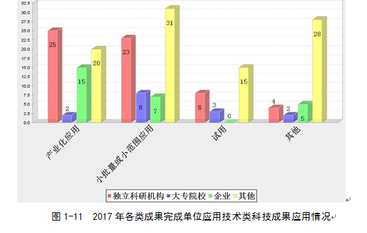 從穩(wěn)定應用成果在各單位應用技術成果登記中所占比例來看,獨立科研機構、大專院校、企業(yè)、其他單位分別為41.7%、13.3%、55.6%、21.3%,穩(wěn)定應用成果比重均比較高。其次為小批量應用項目,分別為38.3%、53.3%、25.9%、33.0%。再次為試用項目,分別為13.3%、20.0%、0.0%、16.0%。(見圖1-11)。