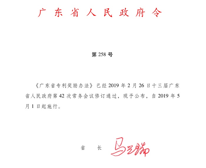 第二十五條 本辦法自2019年5月1日起施行。廣東省人民政府2014年8月27日公布的《廣東省專利獎(jiǎng)勵(lì)辦法》(廣東省人民政府令第202號(hào))同時(shí)廢止。