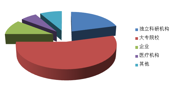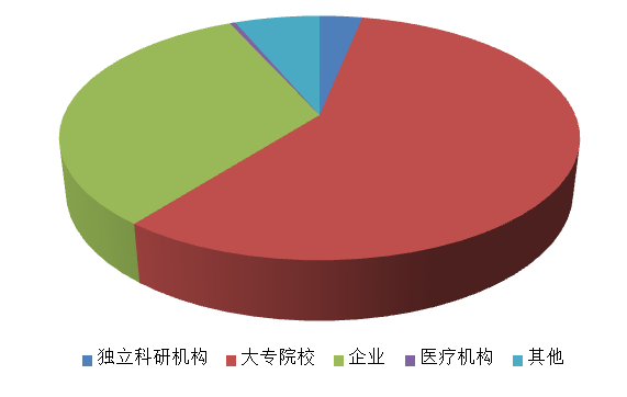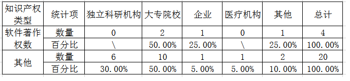 2018年,登記項(xiàng)目中擁有知識(shí)產(chǎn)權(quán)項(xiàng)目為24項(xiàng)。其中,軟件著作權(quán)數(shù)為4項(xiàng),占項(xiàng)目總數(shù)的16.67%;其他為20項(xiàng),占項(xiàng)目總數(shù)的83.33%。已授權(quán)專利數(shù)為15項(xiàng)。從獲得知識(shí)產(chǎn)權(quán)項(xiàng)目的承擔(dān)單位性質(zhì)來(lái)看,大多數(shù)為獨(dú)立科研機(jī)構(gòu)和大專院校,分別為6個(gè)和12個(gè),占總數(shù)的25%和50%;企業(yè)為2個(gè)、醫(yī)療機(jī)構(gòu)為1個(gè)、其他為3個(gè)。知識(shí)產(chǎn)權(quán)項(xiàng)目分布見(jiàn)圖3。