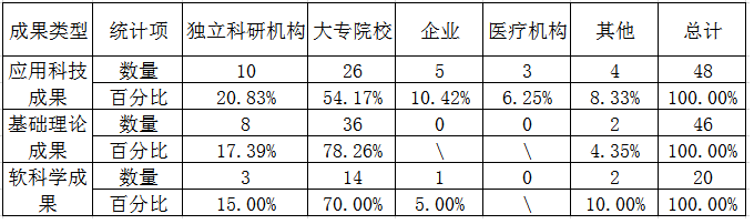 2018年,登記項(xiàng)目中應(yīng)用技術(shù)類項(xiàng)目共48項(xiàng),其中,獨(dú)立科研機(jī)構(gòu)和大專院校為10項(xiàng)和26項(xiàng),分別占項(xiàng)目總數(shù)的20.83%和54.17%;企業(yè)為5項(xiàng),醫(yī)療機(jī)構(gòu)為3項(xiàng),其他為4項(xiàng),占項(xiàng)目總數(shù)的10.42%、6.25%、8.33%。應(yīng)用技術(shù)類成果機(jī)構(gòu)分布見(jiàn)圖7。