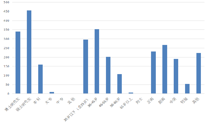 2018年,登記項(xiàng)目中涉及到的完成人員共966人。其中,文化程度方面,博士研究生為339人,碩士研究生為455人,本科為160人,大專為10人,其他為2人,分別占人員總數(shù)的35.09%、47.10%、16.56%、1.04%、0.21%;年齡結(jié)構(gòu)方面,呈現(xiàn)老中青合理分布的狀態(tài),35歲以下為296人,36-45歲為354人,46-55歲為201人,56-65歲為108人,65歲以上為7人,分別占人員總數(shù)的30.64%、36.65%、20.81%、11.18%、0.72%;技術(shù)職稱方面,有院士職稱的為1人,正高職稱的為231人,副高職稱的為267人,中級(jí)職稱的為191人,初級(jí)職稱的為53人,其他為223人,分別占人員總數(shù)的0.1%、23.91%、27.64%、19.77%、5.49%、23.08%。具體情況見(jiàn)圖6。