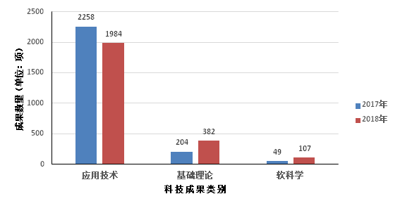登記成果總數(shù)的15.45%,較2017年增加了178項(xiàng),增長率達(dá)87.25%;軟科學(xué)成果107項(xiàng),占2018年 登記成果總數(shù)的4.33%,較2017年增加了58項(xiàng),增長率達(dá)118.37%(見圖1)。