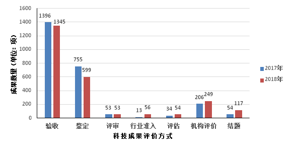 2018年登記的科技成果中,評(píng)價(jià)方式為項(xiàng)目驗(yàn)收的有1345項(xiàng),占2018年 成果登記總數(shù)的54.39%,較2017年減少了51項(xiàng),下降了3.65%;評(píng)價(jià)方式為鑒定的有599項(xiàng),占2018年