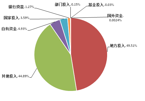 2018年 ,廣東省登記成果的課題來源以地方計(jì)劃為主,有1244項(xiàng),占2018年 成果登記總數(shù)的50.30%;其他來源按數(shù)量排序依次為:自選615項(xiàng)、國家科技計(jì)劃302項(xiàng)、地方基金117項(xiàng)、部門計(jì)劃77項(xiàng)、其他計(jì)劃68項(xiàng)、橫向委托23項(xiàng)、部門基金14項(xiàng)、國際合作13項(xiàng)(見圖3)。2018年廣東省登記的科技成果投入經(jīng)費(fèi)總額達(dá)2103.84億元,以地方投入為主,達(dá)1041.67億元,占2018年經(jīng)費(fèi)來源投入總額的49.51%;其次,其他投入944.38億元,自有資金投入達(dá)103.69億元,國家投入75.54億元,部門投入31.36億元,銀行貸款26.77億元,基金投入0.67億元,國外資金投入0.05億元(見圖4)。