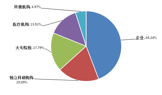2018年廣東省登記的科技成果中,按各牽頭單位類型完成項(xiàng)目數(shù)排序,依次為:企業(yè)1094項(xiàng)、獨(dú)立科研機(jī)構(gòu)472項(xiàng)、大專院校440項(xiàng)、醫(yī)療機(jī)構(gòu)344項(xiàng)、其他機(jī)構(gòu)123項(xiàng)。牽頭單位為企業(yè)登記的成果數(shù)占總數(shù)的44.24%,是本年度廣省科技成果的主要登記單位(見圖5)。