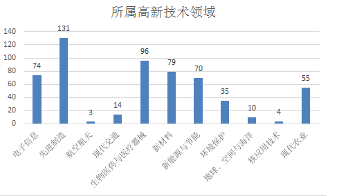 2018年江蘇應(yīng)用技術(shù)成果所屬高新技術(shù)領(lǐng)域分布,電子信息74項(xiàng),先進(jìn)制造131項(xiàng),航空航天3項(xiàng),現(xiàn)代交通14項(xiàng),生物醫(yī)藥與醫(yī)療器械96項(xiàng),新材料79項(xiàng),新能源與節(jié)能70項(xiàng),環(huán)境保護(hù)35項(xiàng),地球、空間與海洋10項(xiàng),核應(yīng)用技術(shù)4項(xiàng),現(xiàn)代農(nóng)業(yè)55項(xiàng)。