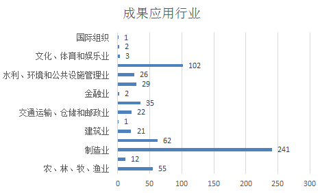 2018年江蘇科技成果應(yīng)用行業(yè)涉及15個(gè)方面,農(nóng)、林、牧、漁業(yè)55項(xiàng),采礦業(yè)12項(xiàng),制造業(yè)241項(xiàng),電力、熱力、燃?xì)饧八纳a(chǎn)和供應(yīng)業(yè)62項(xiàng),建筑業(yè)21項(xiàng),交通運(yùn)輸、倉(cāng)儲(chǔ)和郵政業(yè)22項(xiàng),信息傳輸、軟件和信息技術(shù)服務(wù)業(yè)35項(xiàng),科學(xué)研究和技術(shù)服務(wù)業(yè)29項(xiàng),水利、環(huán)境和公共設(shè)施管理業(yè)26項(xiàng),衛(wèi)生和社會(huì)工作102項(xiàng),文化、體育和娛樂業(yè)3項(xiàng),公共管理、社會(huì)保障和社會(huì)組織2項(xiàng)。
