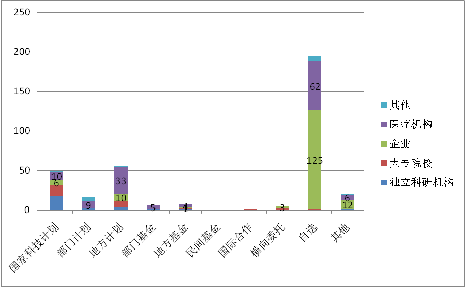 據(jù)統(tǒng)計(jì),登記成果第一完成單位分布主要集中在企業(yè)。其中企業(yè)完成的項(xiàng)目占總項(xiàng)目的44.23%,其中自選課題中企業(yè)完成項(xiàng)目占總項(xiàng)目的64.43%,醫(yī)療機(jī)構(gòu)自選完成的項(xiàng)目為62項(xiàng),占總項(xiàng)目的31.96%。(見圖2)。