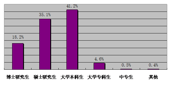 成果完成人情況中,按文化程度區(qū)分:博士研究生1191名,占完成人總?cè)藬?shù)的18.2%;碩士研究生2292名,占完成人總?cè)藬?shù)的35.1%;大學(xué)本科生2688名,占完成人總?cè)藬?shù)的41.2%;大學(xué)??粕?span lang="EN-US">300名,占完成人總?cè)藬?shù)的4.6%;中專生33名,占完成人總?cè)藬?shù)的0.5%;其他學(xué)歷24名,占完成人總?cè)藬?shù)的0.4%(見圖表7)。統(tǒng)計(jì)數(shù)據(jù)顯示,我區(qū)的科技工作者隊(duì)伍以大學(xué)本科及以上學(xué)歷為主。