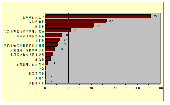 林、牧、漁業(yè)項(xiàng)目106項(xiàng),占應(yīng)用技術(shù)成果總數(shù)的19.6%;第三是制造業(yè)84項(xiàng),占應(yīng)用技術(shù)成果總數(shù)的15.6%;其他依次為電力熱力燃?xì)饧八纳a(chǎn)供應(yīng)44項(xiàng),占比8.1%;科學(xué)研究和技術(shù)服務(wù)29項(xiàng),占比5.4%;采礦業(yè)25項(xiàng),占比4.6%;信息傳輸、軟件和信息技術(shù)服務(wù)業(yè)21項(xiàng),占比3.9%;交通運(yùn)輸、倉儲和郵政業(yè)16項(xiàng),占比3%;水利環(huán)境和公共設(shè)施管理業(yè)13項(xiàng)。占比2.4%;建筑業(yè)10項(xiàng),占比1.9%;公共管理、社會保障和社會組織4項(xiàng),占比0.7%;教育行業(yè)1項(xiàng),批發(fā)和零售業(yè)1項(xiàng),房地產(chǎn)業(yè)1項(xiàng),其他服務(wù)業(yè)1項(xiàng),各占比0.2%。
