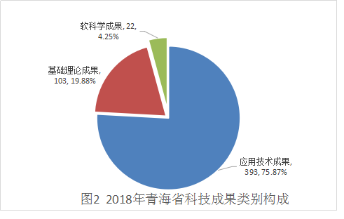 518項科技成果中,如下圖2所示,應用技術(shù)成果393項,占75.87%;基礎理論成果103項,占19.88%;軟科學成果22項,占4.25%。