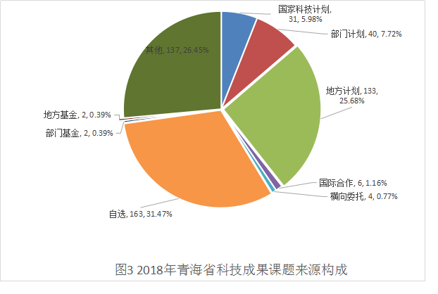 (一)2018年518項科技成果,應用技術(shù)成果393項,占75.87%;基礎理論成果103項,占19.88%;軟科學成果22項,占4.25%。從來源上看,自選課題數(shù)量為163項,成為主要來源,達到31.47%,其中企業(yè)自選課題登記成果69項,占自選課題成果總數(shù)42.33%;地方計劃成果數(shù)次之,達到133項。反映出企業(yè)等科研主體的自主創(chuàng)新意識和能力進一步提高,今后仍需強化鼓勵自主創(chuàng)新、自主選題以及知識產(chǎn)權(quán)保護,提高自選課題成果數(shù)量和質(zhì)量,提高科研主體的創(chuàng)新能力。