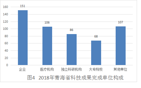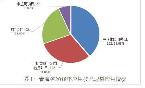 (二)2018年應用技術(shù)成果共393項,其中,產(chǎn)業(yè)化應用成果153項(應用技術(shù)成果總數(shù)的38.68%),小批量或小范圍應用成果122項(31.04%),正在試用的成果92項(23.41%),未應用的成果27項(6.87%)。今后仍需加強我省高校和科研院所創(chuàng)新資源優(yōu)勢,加強產(chǎn)學研合作,促進相關(guān)優(yōu)秀技術(shù)成果的轉(zhuǎn)化,進一步提高產(chǎn)業(yè)化應用水平。從行業(yè)分布看,第一產(chǎn)業(yè)成果共131項,其中獨立科研機構(gòu)和大專院校完成54項,占第一產(chǎn)業(yè)成果數(shù)的41.22%,企業(yè)、事業(yè)單位完成76項,占第一產(chǎn)業(yè)成果數(shù)的比例提高,達58.02%;第二產(chǎn)業(yè)成果共91項,企業(yè)為主力軍,共完成71項,占第二產(chǎn)業(yè)成果數(shù)量78.02%;第三產(chǎn)業(yè)成果數(shù)量較上年增加,主要原因是2017年11月新修訂的《青海省科技成果登記管理辦法》拓展了登記范圍,建筑業(yè)登記科技成果數(shù)量增長明顯,共登記成果66項,其中工法類成果25項。