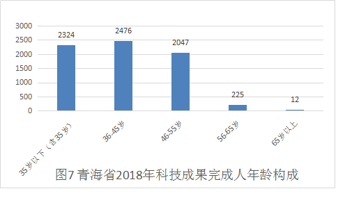 從年齡結(jié)構(gòu)來看,圖7表明,中青年是科技成果研究人員主體。55歲以下科研人員6847人次,占96.65%。其中35歲以下科研人員為2324人次,36-45歲之間科研人員為2476人次,46-55歲之間科研人員為2047人次。56歲以上科研人員為237人次。