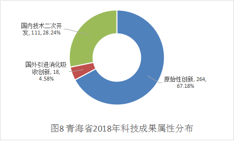 393項應用技術(shù)成果中,按照成果屬性占比從高到低排列依次為:屬于原始性創(chuàng)新的成果過半(占應用技術(shù)成果數(shù)的67.18%),達到264項;屬于國內(nèi)技術(shù)二次開發(fā)成果111項,占28.24%;屬于國外引進消化吸收創(chuàng)新的成果18項,占4.58%。(見圖8)