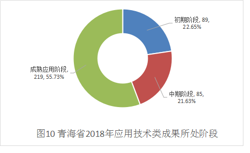 393項應用技術(shù)成果中,如圖10所示,處于成熟應用階段的成果219項,占55.73%,初期階段成果89項,中期階段成果85項。
