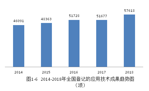 2018年全國(guó)登記的應(yīng)用技術(shù)成果總量比上年有所增長(zhǎng)。2018年全國(guó)共登記應(yīng)用技術(shù)成果57618項(xiàng),比上年增長(zhǎng)11.50%,占全國(guó)登記成果總數(shù)的87.67%。