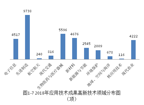 2018年登記的應(yīng)用技術(shù)成果中,高新技術(shù)領(lǐng)域科技成果達(dá)到35153項(xiàng),占應(yīng)用技術(shù)成果總數(shù)的61.01%。高新技術(shù)領(lǐng)域成果主要分布在先進(jìn)制造,生物醫(yī)藥與醫(yī)療器械,新材料,電子信息,現(xiàn)代農(nóng)業(yè)等高新技術(shù)領(lǐng)域,這五個(gè)領(lǐng)域的應(yīng)用技術(shù)成果達(dá)到28749項(xiàng),占高新技術(shù)領(lǐng)域科技成果總數(shù)的81.78%(見圖1-7)。