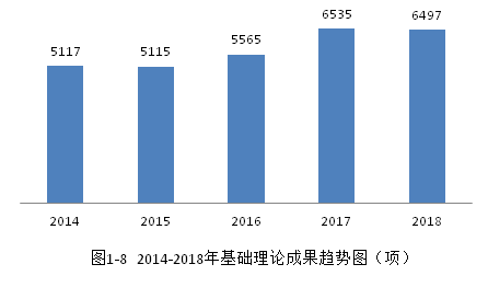 從近五年的情況來(lái)看,全國(guó)登記的基礎(chǔ)理論成果總量基本呈現(xiàn)平穩(wěn)增長(zhǎng)狀態(tài),從2014年的5117項(xiàng)到2018年6497項(xiàng),四年間增長(zhǎng)26.97%。