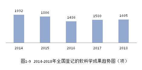 2018年全國(guó)登記的軟科學(xué)成果1605項(xiàng),比上年增長(zhǎng)1.58%,占全國(guó)登記成果總數(shù)的2.44%。