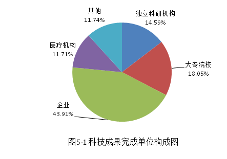 從2014-2018年登記的科技成果的情況來看,科技成果完成單位類型的構(gòu)成情況變化不大,企業(yè)一直是科技成果的主要完成單位,在全部完成單位中的比例占四成多(見表5-1)。