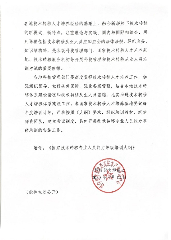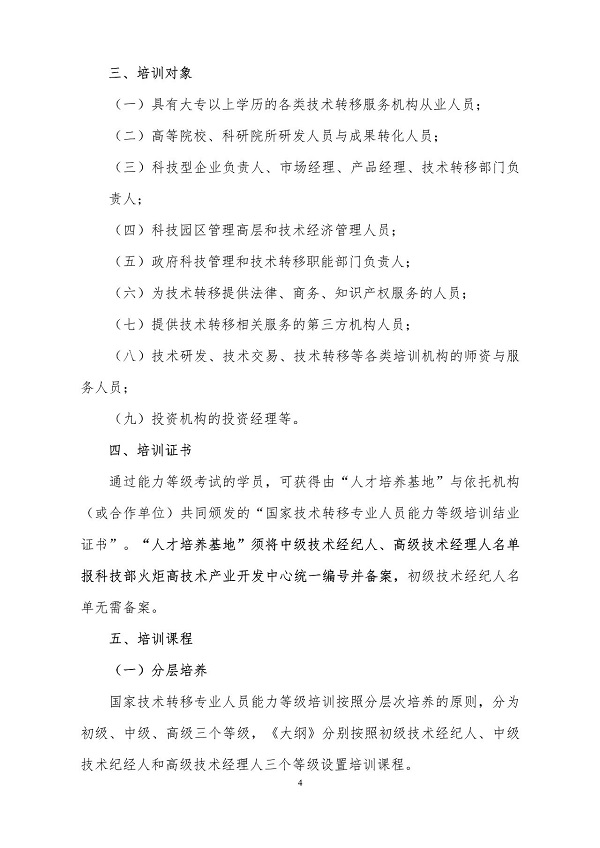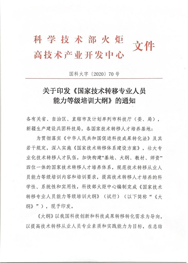為了貫徹落實(shí)《中華人民共和國促進(jìn)科技成果轉(zhuǎn)化法》若干規(guī)定,深入實(shí)施《國家技術(shù)轉(zhuǎn)移體系建設(shè)方案》,壯大專業(yè)化技術(shù)轉(zhuǎn)移人才隊(duì)伍,加快構(gòu)建“基地、大綱、教材、師資”四位一體的國家技術(shù)轉(zhuǎn)移人才培養(yǎng)體系,規(guī)范技術(shù)轉(zhuǎn)移從業(yè)人員能力等級培訓(xùn)內(nèi)容和培訓(xùn)要求,日前,科技部火炬中心發(fā)布了《國家技術(shù)轉(zhuǎn)移專業(yè)人員能力等級培訓(xùn)大綱》(試行)(國科火字〔2020〕70號)(以下簡稱“《大綱》”)。