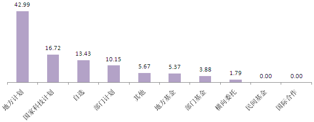 以各級(jí)財(cái)政支持的計(jì)劃項(xiàng)目成果為主。其中,來源于各級(jí)科技計(jì)劃項(xiàng)目的成果234項(xiàng),占69.85%;部門基金和地方基金項(xiàng)目成果31項(xiàng),占9.25%。在各級(jí)科技計(jì)劃項(xiàng)目中,國(guó)家科技計(jì)劃項(xiàng)目成果占登記總量的16.72%;部門科技計(jì)劃項(xiàng)目成果占10.15%;地方科技計(jì)劃項(xiàng)目成果占42.99%。在國(guó)家科技計(jì)劃項(xiàng)目成果中,國(guó)家科技重大專項(xiàng) 23項(xiàng),占登記總量的6.87%;國(guó)家其他科技計(jì)劃28項(xiàng),占登記總量的8.36%。見圖2。