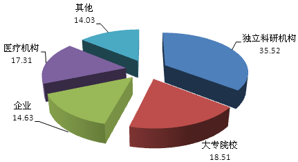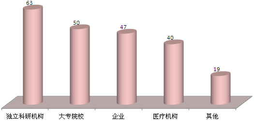 獨(dú)立科研院所和大專院校是項(xiàng)目成果的主要完成單位,按成果數(shù)量排序依次是:獨(dú)立科研機(jī)構(gòu)119項(xiàng),占35.52%;大專院校62項(xiàng),占18.51%;醫(yī)療機(jī)構(gòu)58項(xiàng),占17.31%;企業(yè)49項(xiàng),占14.63%;其他項(xiàng)目47項(xiàng),占14.03%(見圖3)。