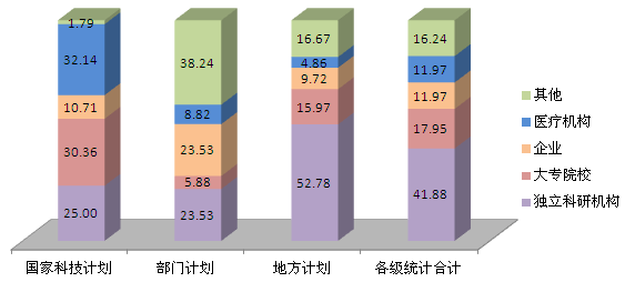 在234項(xiàng)各級(jí)科技計(jì)劃項(xiàng)目成果中,獨(dú)立科研機(jī)構(gòu)與大專院校是主要完成單位。其中,獨(dú)立科研院所所占比例最高,為41.88%;其次是大專院校,為17.95%;企業(yè)和醫(yī)療機(jī)構(gòu)占11.97%。各級(jí)科技計(jì)劃完成單位情況見圖4。