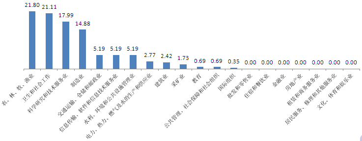 應(yīng)用技術(shù)成果主要應(yīng)用于農(nóng)、林、牧、漁業(yè)與衛(wèi)生和社會(huì)工作行業(yè),分別占21.80%和21.11%;科學(xué)研究和技術(shù)服務(wù)業(yè)與制造業(yè)等應(yīng)用成果也占較大比例,共32.87%(見圖7)。