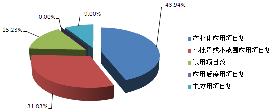 目前,已應(yīng)用的技術(shù)成果有219項(xiàng),占應(yīng)用技術(shù)成果的75.77%;試用項(xiàng)目數(shù)44項(xiàng),占應(yīng)用技術(shù)成果的15.23%;未應(yīng)用項(xiàng)目數(shù)26項(xiàng),占應(yīng)用技術(shù)成果的9.00%(見圖8)。