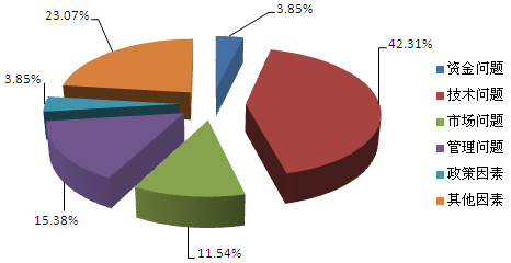 在289項(xiàng)應(yīng)用技術(shù)成果中,有26項(xiàng)未應(yīng)用。其中有11項(xiàng)因技術(shù)問題未應(yīng)用,另有管理問題4項(xiàng),市場(chǎng)問題3項(xiàng),資金問題和政策因素各1項(xiàng)(見圖10)。