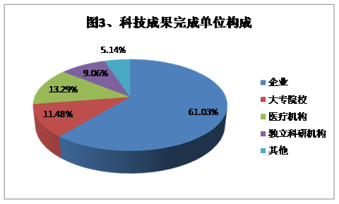 在331項(xiàng)科技成果中,企業(yè)完成202項(xiàng),占比61.03%;大專院校完成38項(xiàng),占比11.48%;醫(yī)療機(jī)構(gòu)完成44項(xiàng),占比13.29%;獨(dú)立科研機(jī)構(gòu)完成30項(xiàng),占比9.06%;其他完成17項(xiàng),占比5.14%(見(jiàn)圖3)。數(shù)據(jù)表明企業(yè)仍然是主要的成果完成單位,企業(yè)的自主研發(fā)和創(chuàng)新能力在市場(chǎng)競(jìng)爭(zhēng)中的作用日益重要,企業(yè)作為我市技術(shù)創(chuàng)新主體,其自主創(chuàng)新能力在不斷提高。