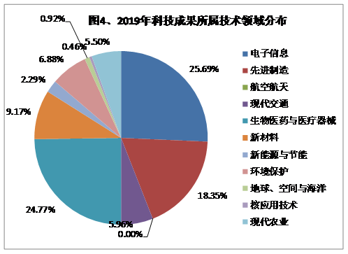 2019年登記的科技成果屬高新技術(shù)領(lǐng)域的有218項(xiàng),其中電子信息56項(xiàng),先進(jìn)制造40項(xiàng),現(xiàn)代交通13項(xiàng),生物醫(yī)藥和醫(yī)療器械54項(xiàng),新材料20項(xiàng),新能源與節(jié)能5項(xiàng),環(huán)境保護(hù)15項(xiàng),地球、空間與海洋2項(xiàng),核應(yīng)用技術(shù)1項(xiàng),現(xiàn)代農(nóng)業(yè)12項(xiàng)(見(jiàn)圖4)。電子信息、先進(jìn)制造、生物醫(yī)藥和醫(yī)療器械、新材料、新能源與節(jié)能占了其中的80.28%,體現(xiàn)了我市支柱產(chǎn)業(yè)與戰(zhàn)略性新興產(chǎn)業(yè)的優(yōu)勢(shì)。