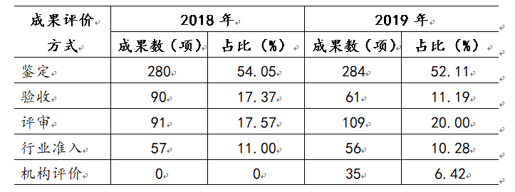 表1 2019年與2018年科技成果評(píng)價(jià)方式統(tǒng)計(jì)表