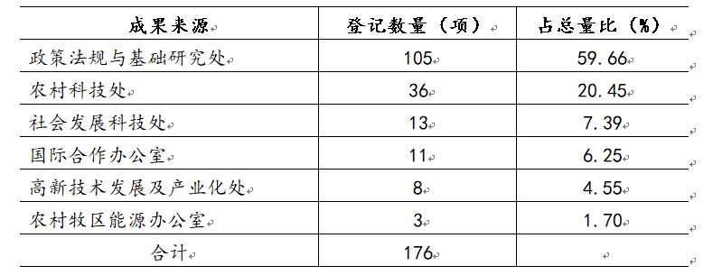 其中,省科技廳下達(dá)的項(xiàng)目登記成果176項(xiàng),進(jìn)一步按照廳處室進(jìn)行劃分,按照成果數(shù)量由高到低依次排序?yàn)椋赫叻ㄒ?guī)與基礎(chǔ)研究處105項(xiàng),農(nóng)村科技處36項(xiàng),社會(huì)發(fā)展科技處13項(xiàng),國(guó)際合作辦公室11項(xiàng),高新技術(shù)發(fā)展及產(chǎn)業(yè)化處8項(xiàng),農(nóng)村牧區(qū)能源辦公室3項(xiàng)。(見(jiàn)表2)