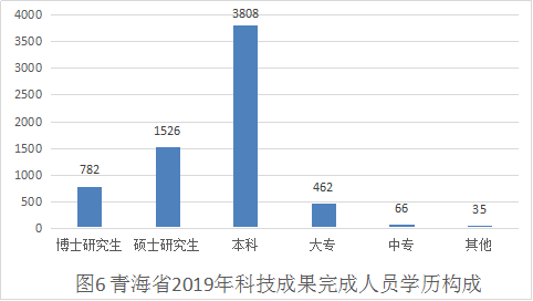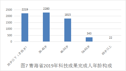 2019年單個(gè)科技成果平均完成人員數(shù)量、各學(xué)歷層次人員比例、各年齡段人員比例均與2018年基本相同,與全國(guó)2018年情況相比,青海省單個(gè)成果12名完成人,全國(guó)為6名;青海省博士研究生占比11.71%,全國(guó)為20.88%;青海省碩士研究生占比22.85%,全國(guó)為29.92%;青海省本科占比57.01%,全國(guó)為38.30%;青海省55歲以下人員占比94.54%,全國(guó)為91.73%。