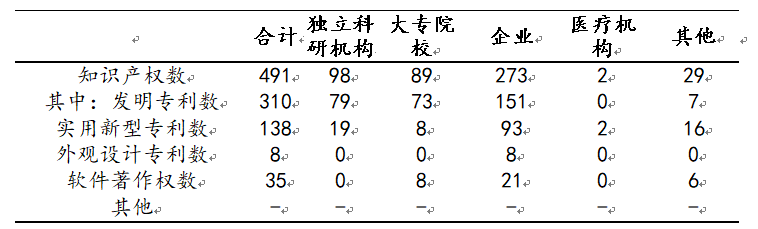 2019年度形成知識(shí)產(chǎn)權(quán)491件。其中,發(fā)明專(zhuān)利達(dá)310項(xiàng),占知識(shí)產(chǎn)權(quán)數(shù)的63.14%;實(shí)用新型專(zhuān)利138項(xiàng),占28.11%;外觀設(shè)計(jì)專(zhuān)利8件,軟件著作權(quán)35項(xiàng)。(見(jiàn)表4)
