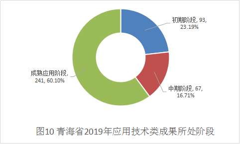 401項(xiàng)應(yīng)用技術(shù)成果中,如圖10所示,處于成熟應(yīng)用階段的成果241項(xiàng),占60.10%,初期階段成果93項(xiàng),中期階段成果67項(xiàng)。