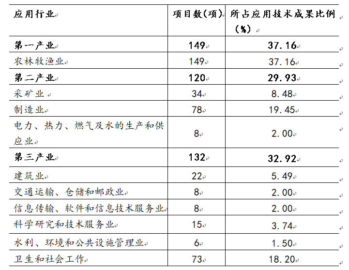 401項(xiàng)應(yīng)用技術(shù)成果行業(yè)分布較廣,體現(xiàn)在10個(gè)應(yīng)用行業(yè)中,按產(chǎn)業(yè)分布進(jìn)行分類(lèi)統(tǒng)計(jì):第一產(chǎn)業(yè)149項(xiàng),占應(yīng)用技術(shù)成果總數(shù)的37.16%;第二產(chǎn)業(yè)共120項(xiàng),占比為29.93%;第三產(chǎn)業(yè)共132項(xiàng),占比為32.92%。(見(jiàn)表5)