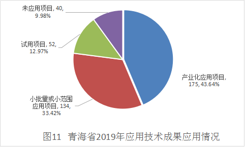 401項(xiàng)應(yīng)用技術(shù)成果中,產(chǎn)業(yè)化應(yīng)用成果175項(xiàng),占應(yīng)用技術(shù)成果總數(shù)的43.64%;小批量或小范圍應(yīng)用成果134項(xiàng),占33.42%;正在試用的成果52項(xiàng),占12.97%,未應(yīng)用的成果40項(xiàng),占9.98%;。(見(jiàn)圖11)
